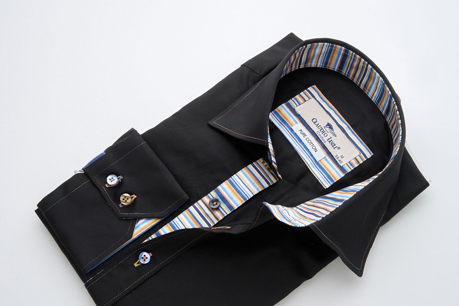 Elevate your smart-casual style with this slim fit black shirt from Santoro Milan. Crafted in pure cotton, it features a striking multicolour stripe contrast on the inner collar, placket, and cuffs, adding a vibrant edge to the classic black base. Finished with multicoloured buttons and fine contrast stitching, this Italian design combines bold detail with sophisticated tailoring.