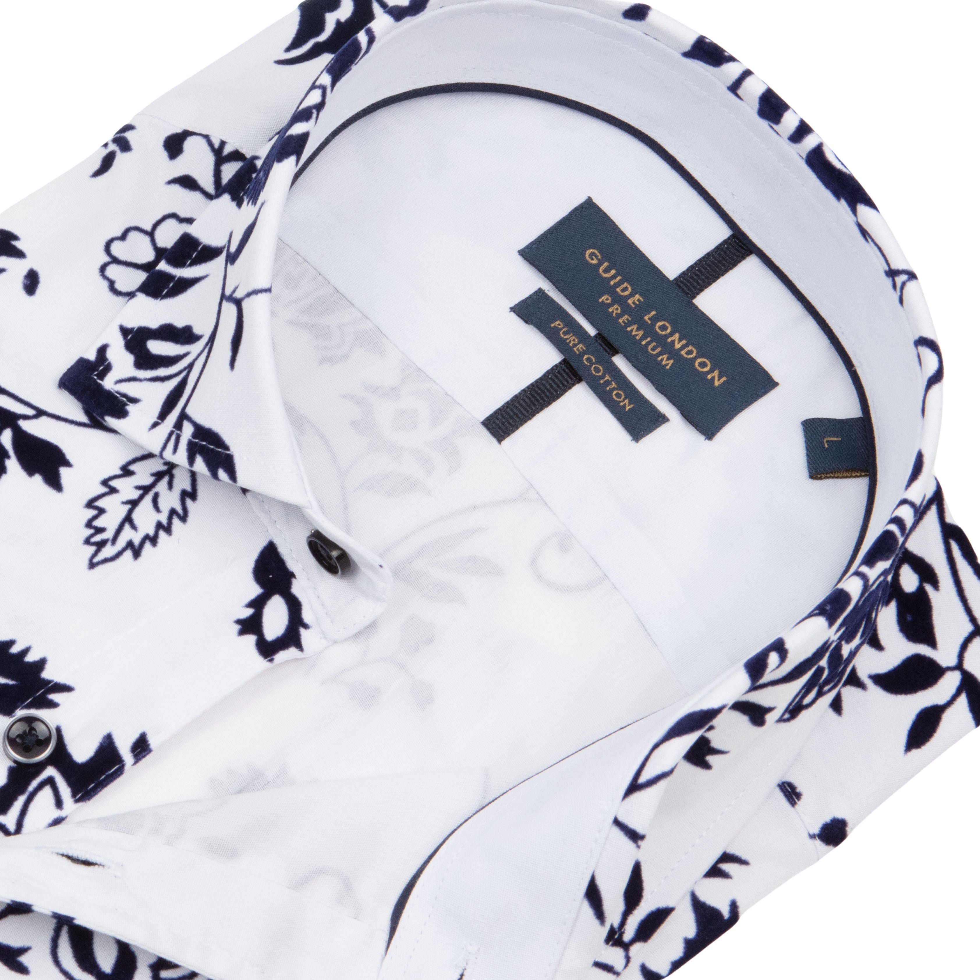 Elevate your wardrobe with this season's must-have shirt, available in classic white, black, and navy. Crafted with precision, it features a luxurious cotton fabric adorned with a delicate flock floral overlay, adding a touch of sophistication. With long sleeves and a timeless spread collar, this shirt is designed to be versatile, effortlessly transitioning from day to night.