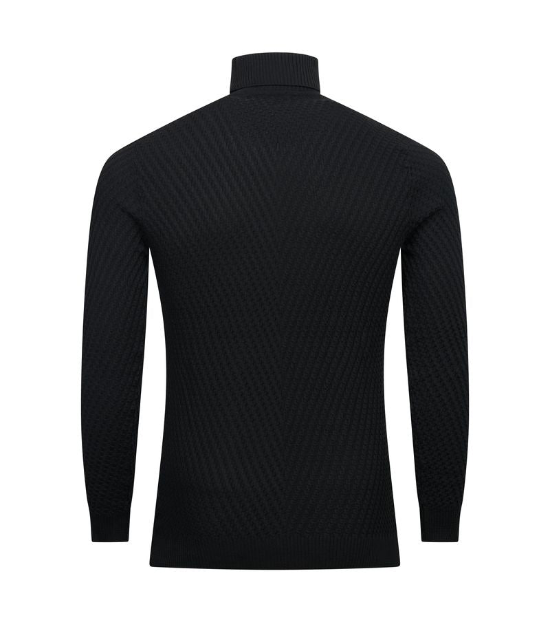 Timeless and versatile, the Santoro Milan Black Textured Turtleneck is a refined essential for every wardrobe. Expertly designed in Italy, this slim fit knit features a subtle textured pattern that elevates its classic silhouette. The soft, stretch fabric ensures a comfortable fit that moves with you, while the black hue offers effortless pairing with tailored trousers, blazers, or denim for a sleek, modern look.