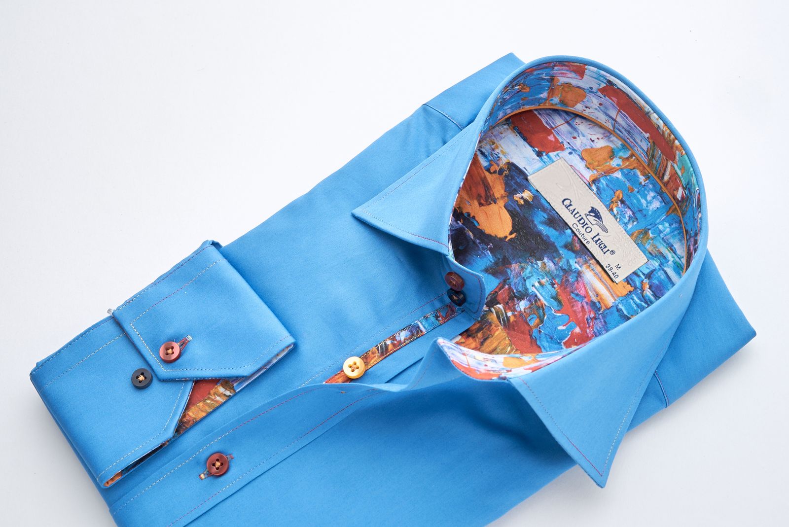 Crafted in Italy, this Claudio Lugli Couture slim fit shirt stands out in a vibrant blue hue. The inner collar and placket feature a bold multicoloured abstract print, adding artistic flair to its sleek design. Finished with contrast stitching and mixed-tone buttons, it brings a modern twist to classic tailoring.