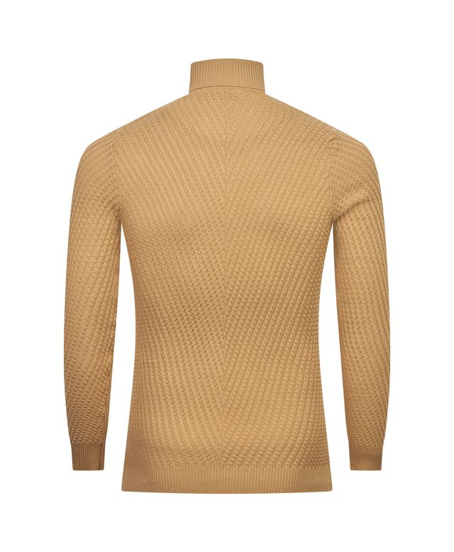 Elevate your winter wardrobe with this Santoro Milan Camel Textured Turtleneck. Crafted in Italy, this slim fit knit combines warmth with refined sophistication. The intricate textured weave adds depth and dimension, while the soft, stretch fabric ensures comfort and a flattering silhouette. Perfect for pairing with tailored trousers or layering under a blazer for a polished seasonal look.