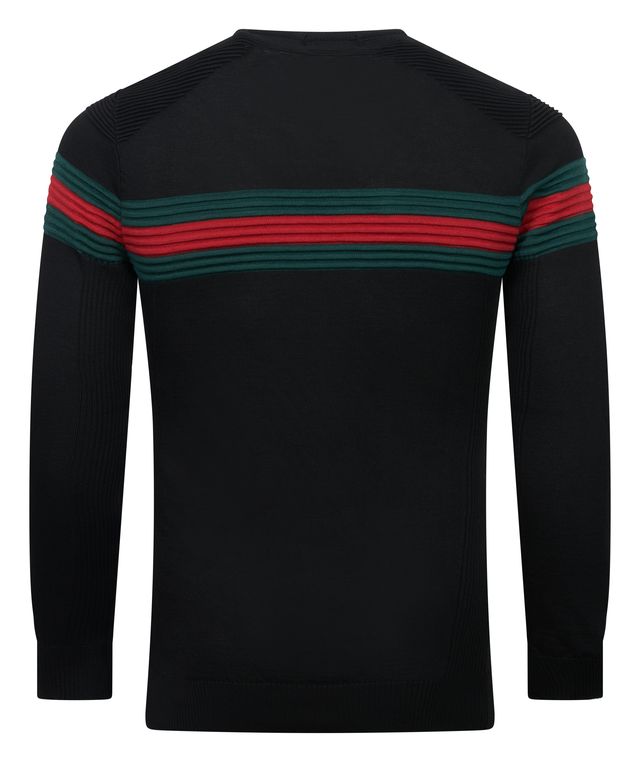 Make a statement in understated luxury with the Santoro Milan Black Crew Neck Jumper featuring bold red and green ribbed stripes across the chest and shoulders. Crafted in Italy, this slim fit knit blends comfort with modern sophistication. The soft stretch fabric and finely ribbed detailing along the sleeves and hem create a sleek silhouette — perfect for both casual and elevated looks.