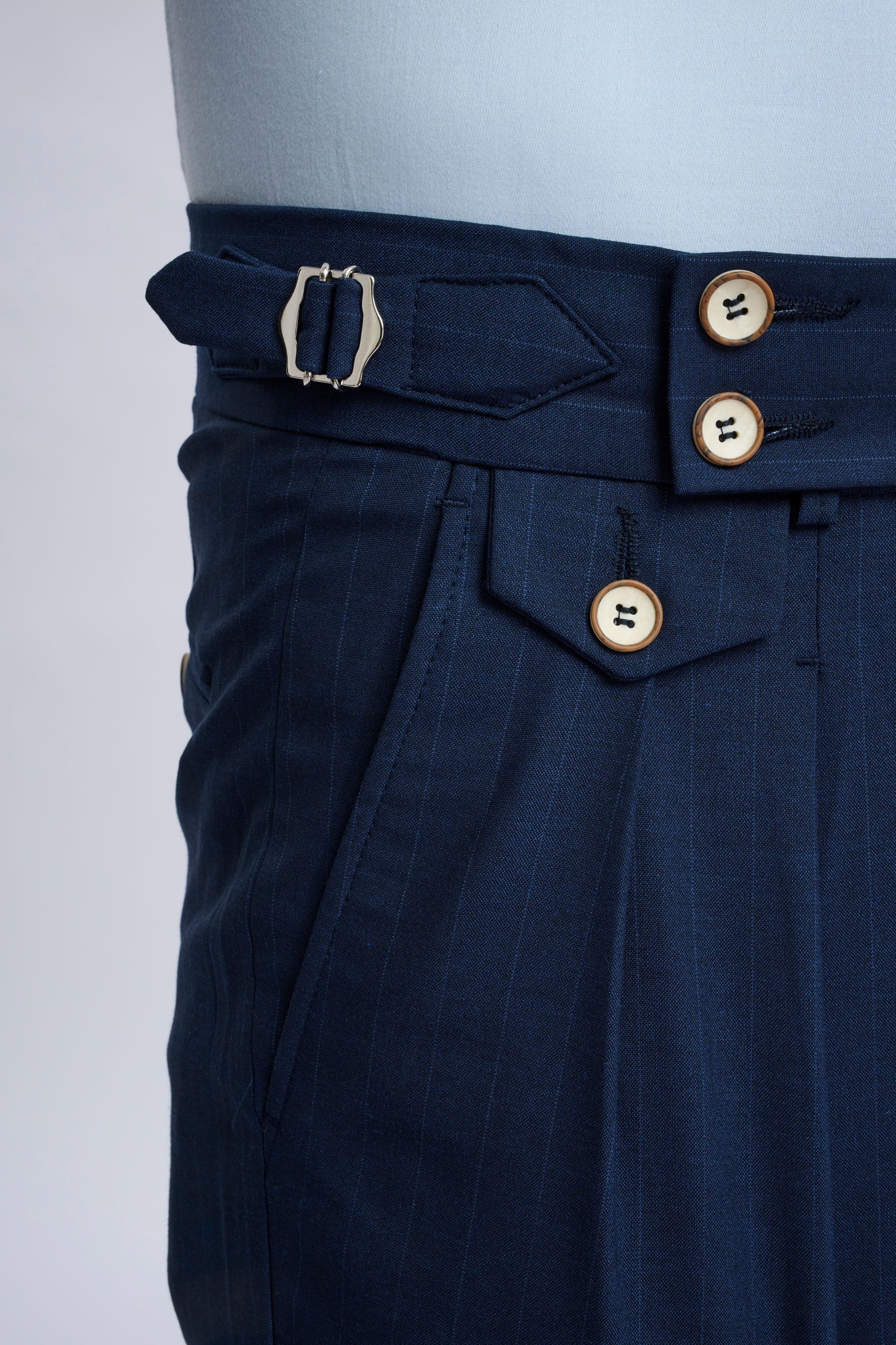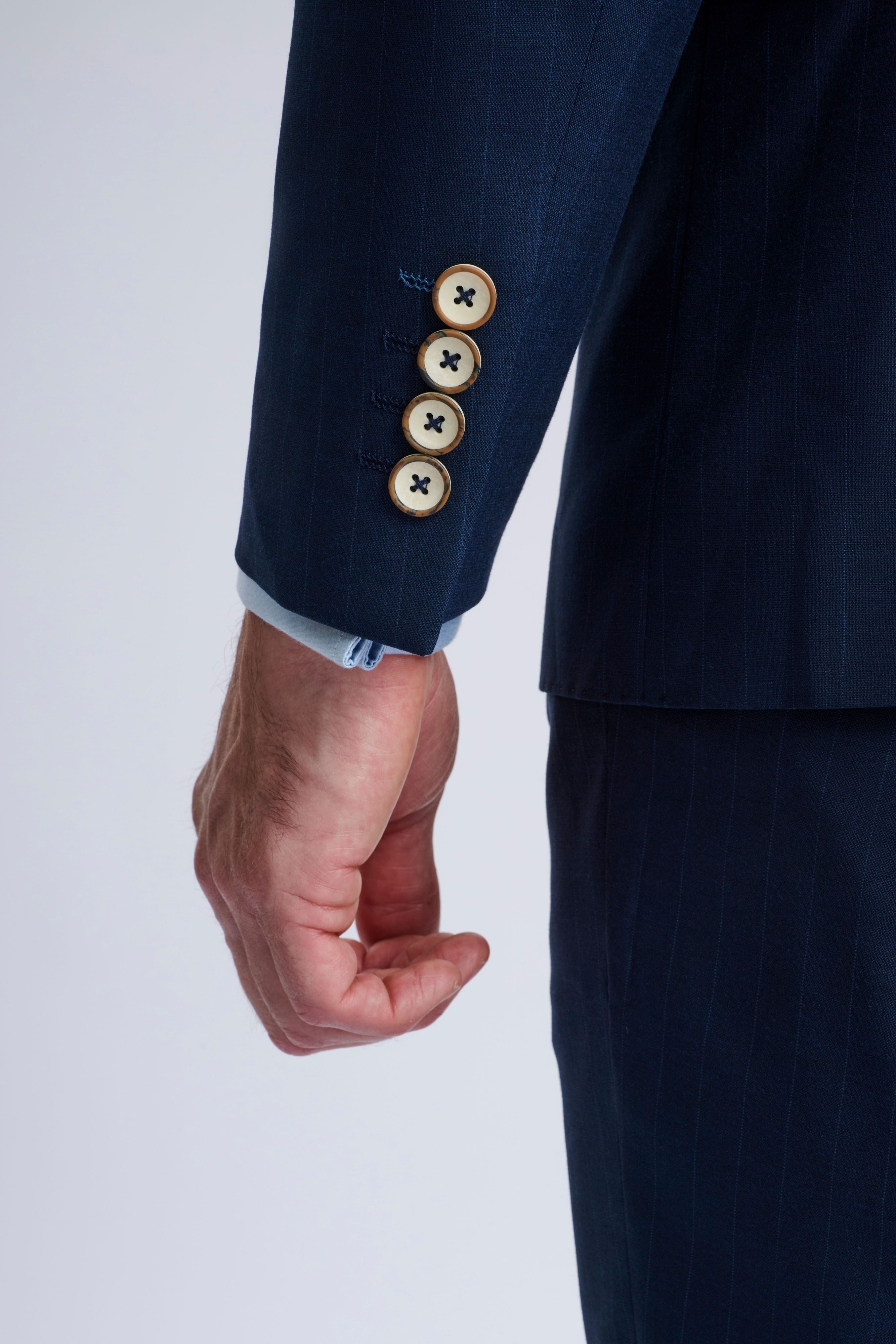• Navy pinstripes that enhance a sleek silhouette