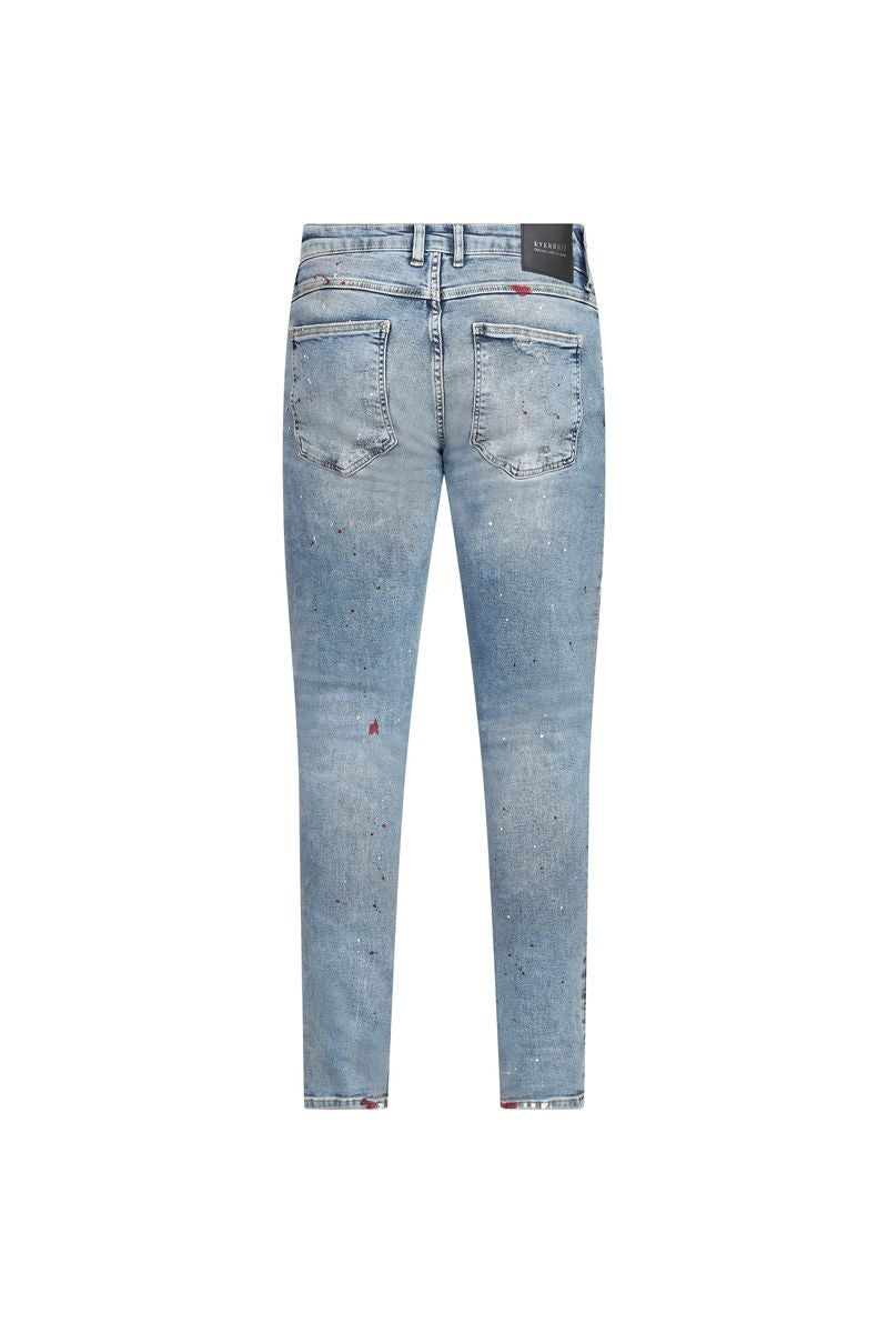Designed with a lived-in edge, the Everrett Paint-Splatter Distressed Skinny Jeans deliver a clean silhouette with raw character. Cut in a skinny fit, these jeans feature a light blue wash with hand-finished distressing, subtle rips, and paint-splatter detailing throughout for a worn-in, street-ready look.