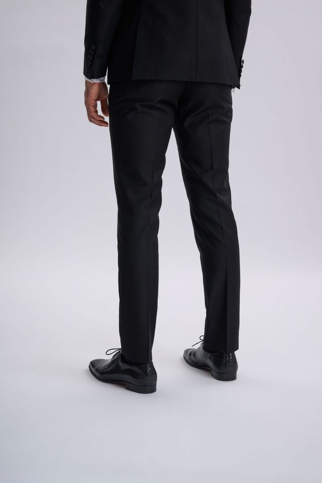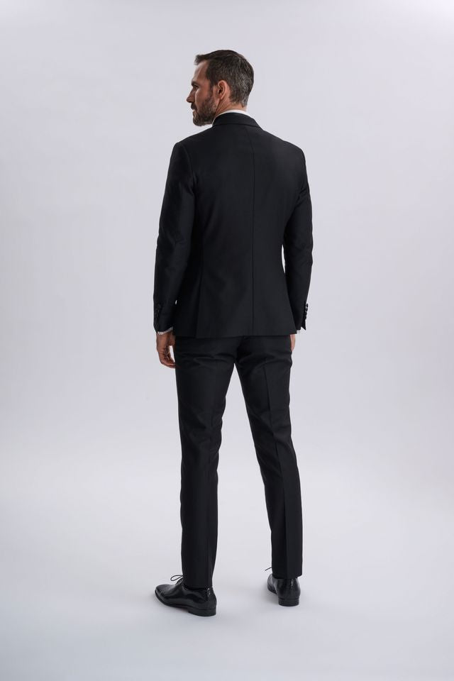 Make a striking impression with the Harry Black Two Piece Tuxedo, a bold take on classic black-tie dressing. Expertly tailored from a premium wool-blend fabric, this sophisticated tuxedo features a double-breasted jacket with satin peak lapels and matching tailored trousers for a sharp, commanding silhouette.