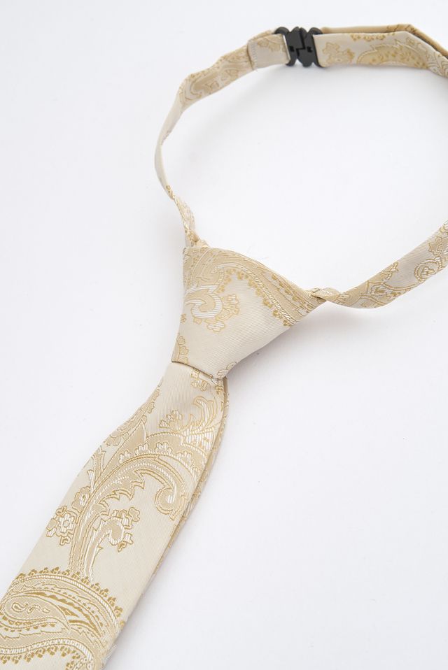 The Junior Champagne Paisley Tie is a sophisticated accessory for formal occasions. Its elegant champagne shade is enhanced with a detailed paisley pattern, adding subtle texture and charm.