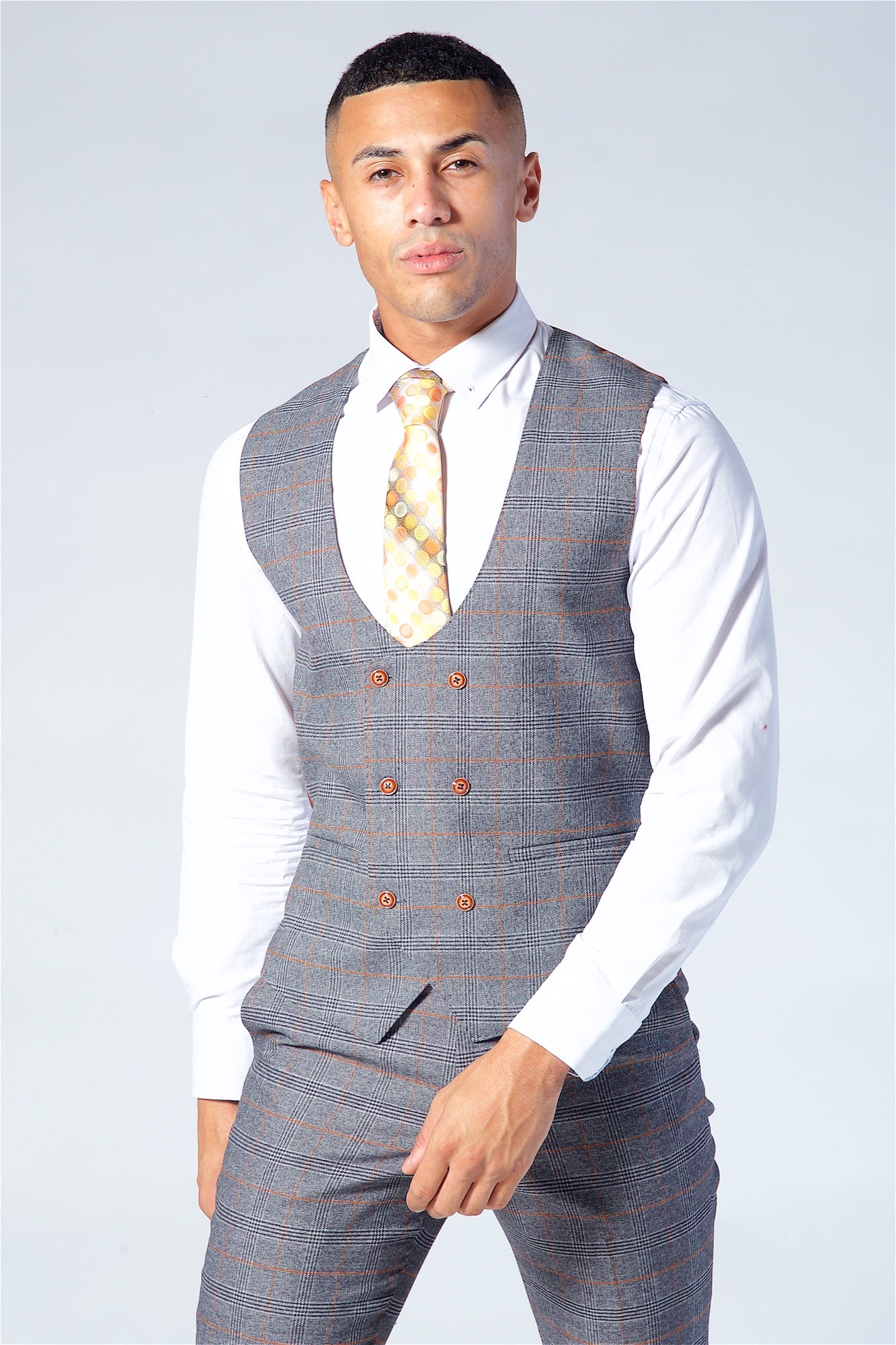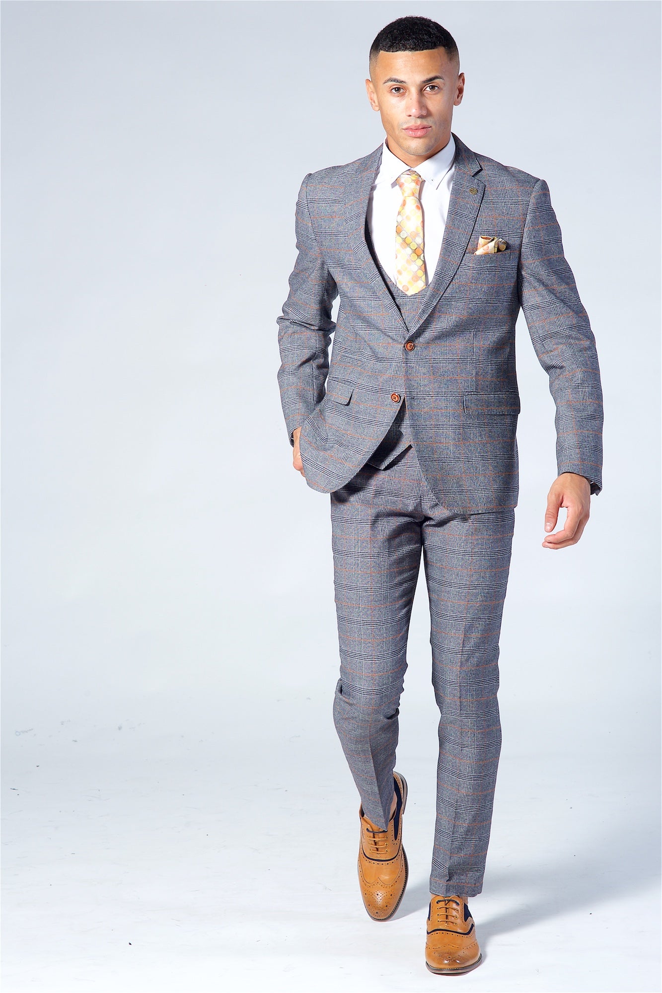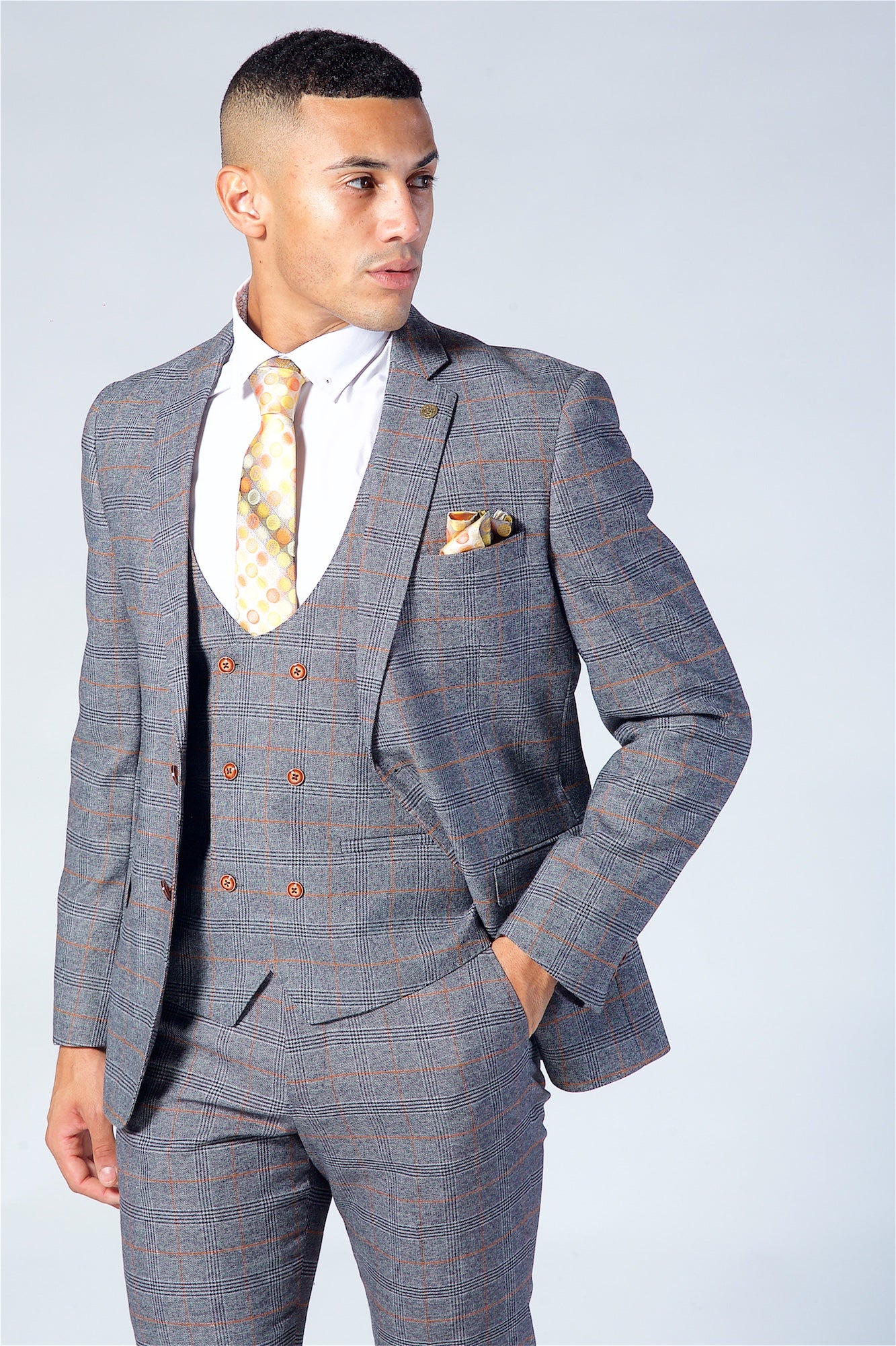 Look slick effortlessly with the Jenson Three piece suit, windowpane check cut to perfection in a slim tailored fit, double breasted waistcoat which gives it that edge.