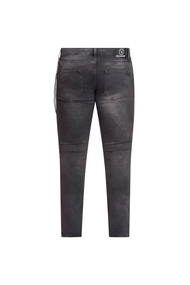 The Ovy Noir Chain Distressed Stretch Denim is crafted from premium luxury stretch denim, delivering a sharp slim fit with a darker, more aggressive edge. Designed in a washed black finish, it features distressed detailing, subtle paint splatter accents, and a removable chain for a refined street-luxury aesthetic.
