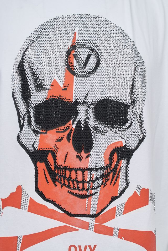 The Ovy Vestimentaire Skull & Bones Tee is a bold statement piece featuring a crystal-embellished skull and crossbones graphic in silver, black, and red. The design is completed with the signature OVV branding and a striking lightning bolt detail running through the skull. Crafted from premium cotton, this tee merges edgy streetwear style with luxury finishes, making it a standout piece in any wardrobe.