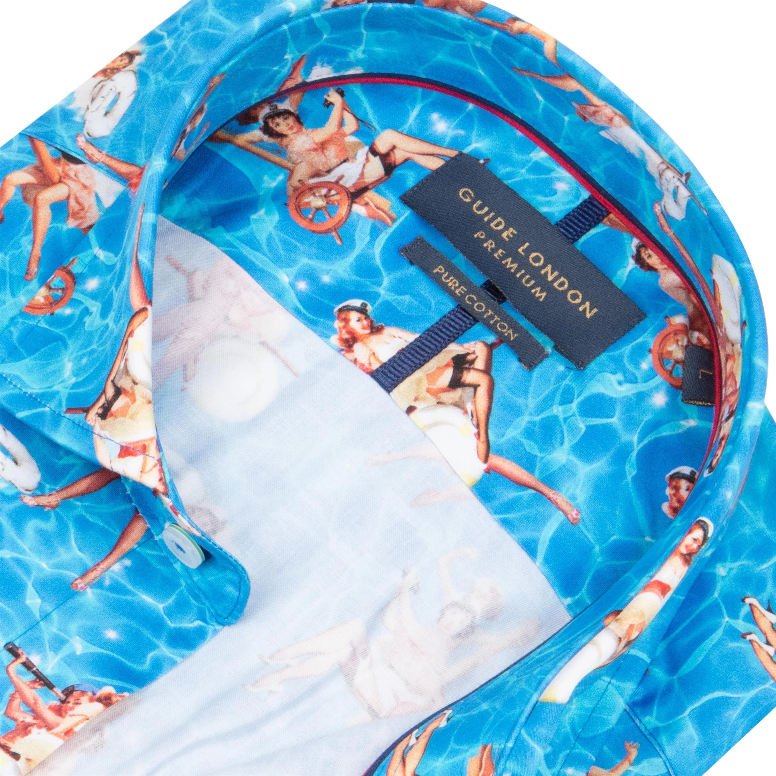 Our latest shirt features a 50s-inspired pin-up print, with retro pin-up ladies out at sea in a nautical-themed design. Made from soft-touch pure cotton with a sateen finish, this shirt offers both style and comfort. The unique print and vintage theme make this shirt a standout piece