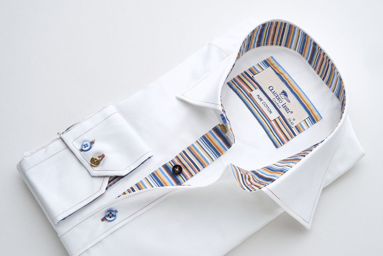 A refined slim fit shirt from Claudio Lugli Couture, crafted from pure cotton in classic white. The collar and placket are detailed with a colourful striped trim for a touch of Italian sophistication, while the multicoloured buttons add playful contrast. Designed in Italy, this shirt balances timeless elegance with modern flair.